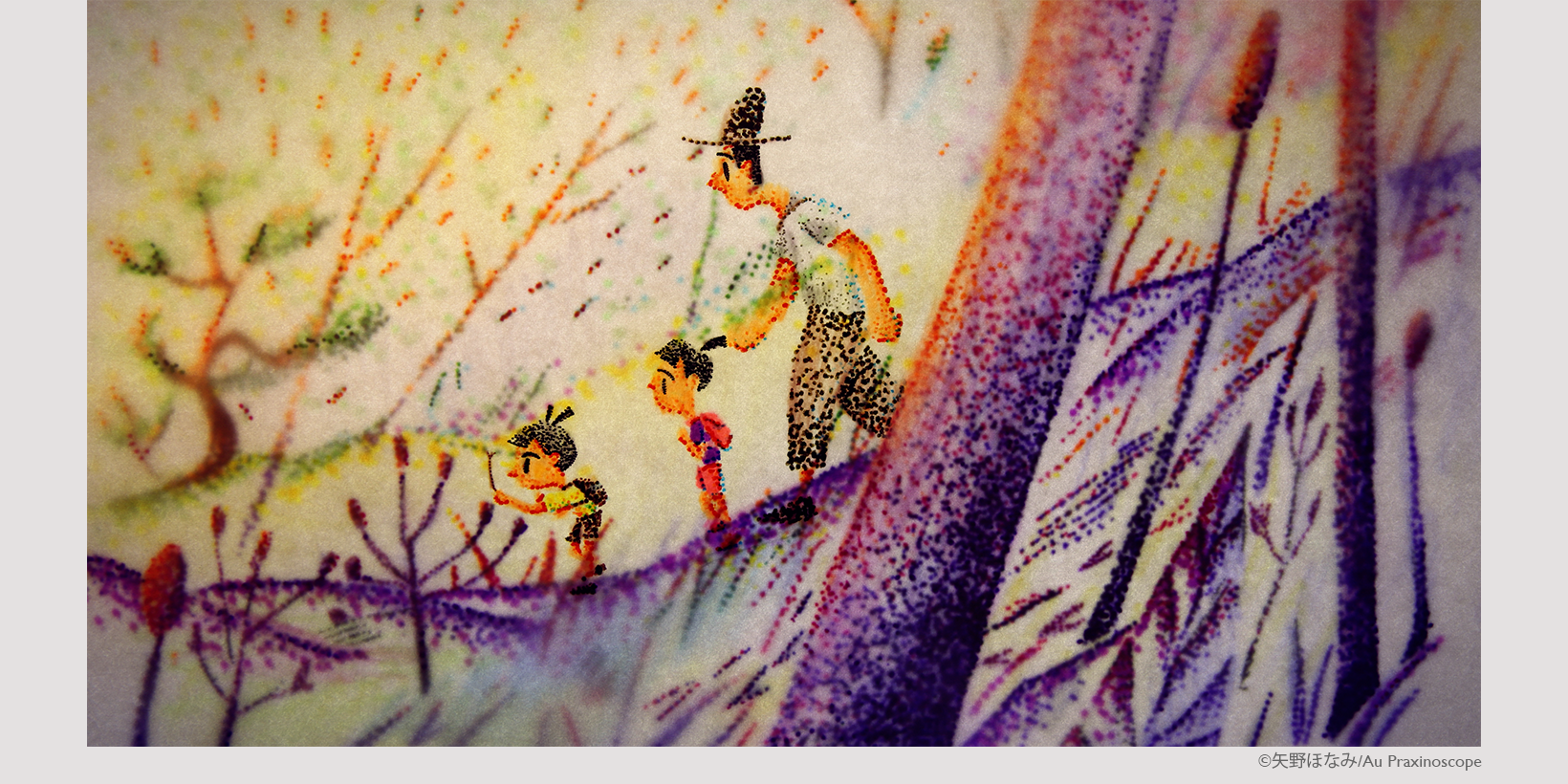 | レビュー | 日本のある地域には「骨嚙み」という、火葬後に死者の骨を食べることで悲しみを乗り越えようとする風習がある。監督自身が幼少期に強く心に残っていた故郷での体験をもとに自身の記憶を元にアニメーションで制作。 子どもの視点で様々なものが新鮮かつ不可思議に、時には異様に描かれており、全編通して点描で描かれ、記憶の断片・光の粒子のように色彩が煌めき心のざわめきを喚起させ美しく引き込まれる作品となっている。(若見 ありさ) |